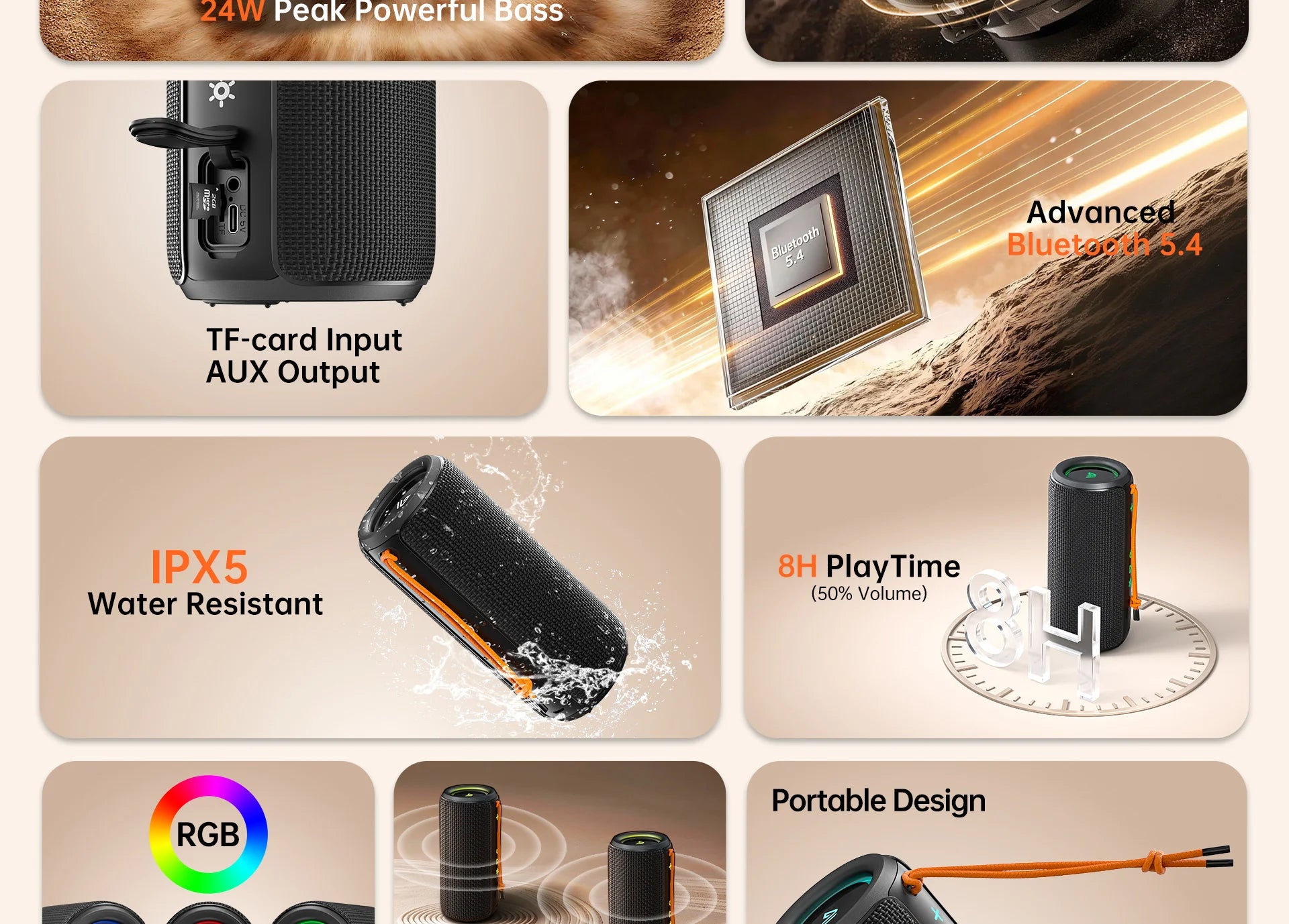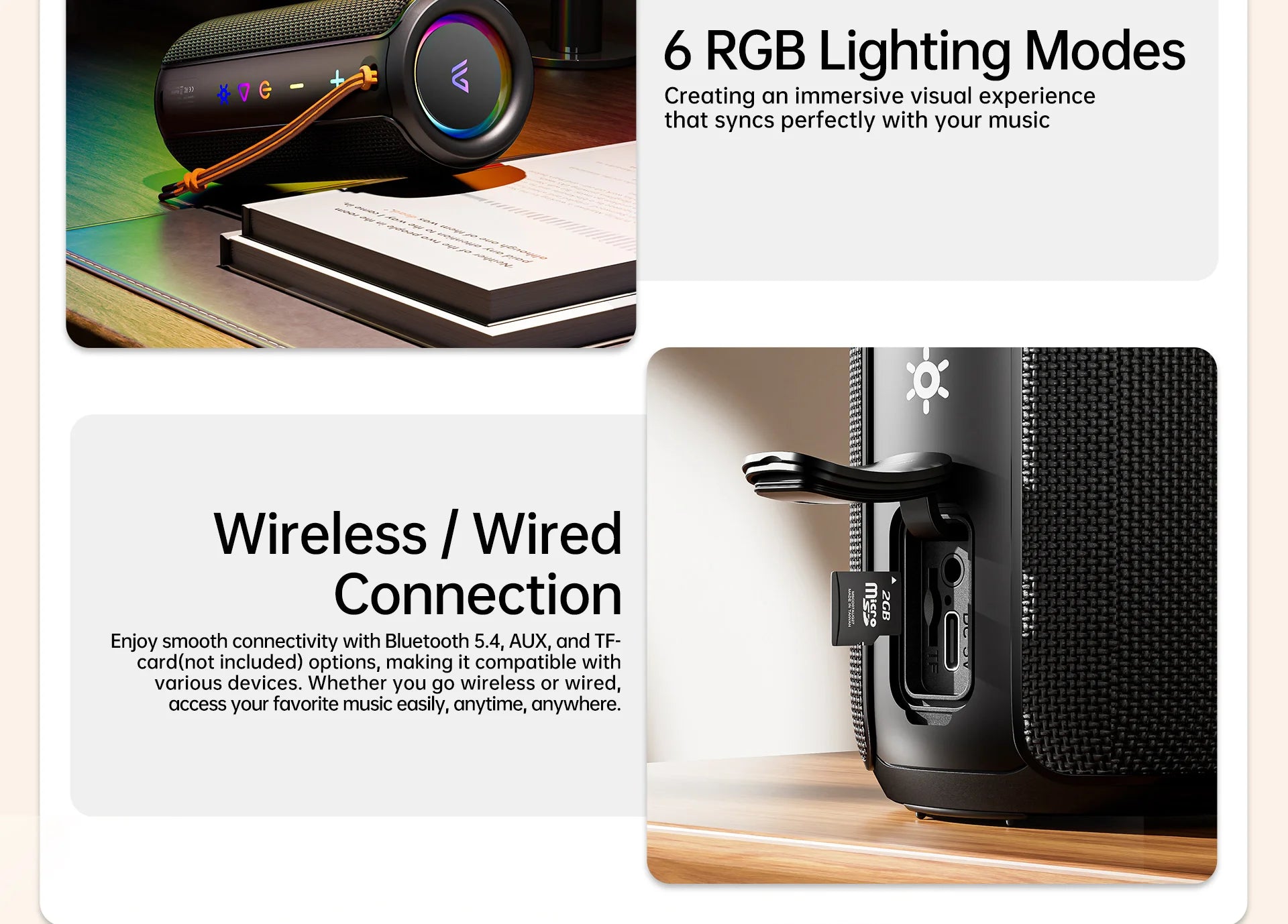 - TF Card Support: The Bluetooth speaker supports TF card playback, letting you enjoy music directly without a phone or other device.