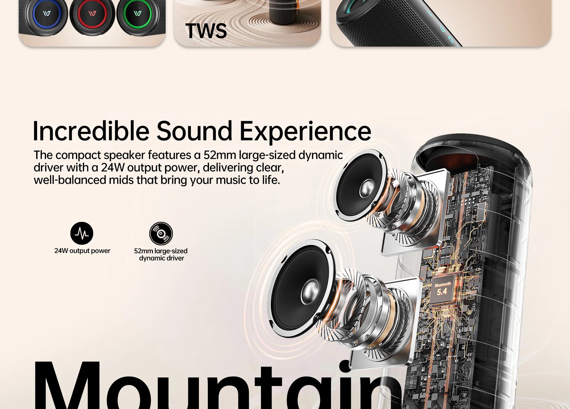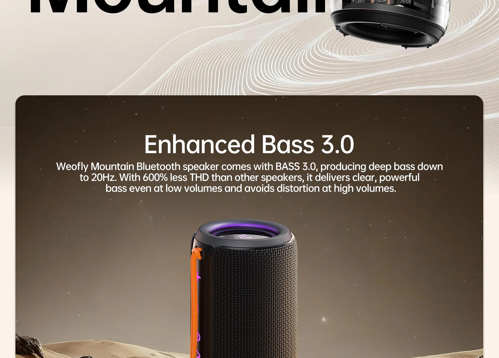 - Peak 24W Deep Bass: Weofly Mountain speaker features a 66mm dynamic driver and a metal bass cone, delivering powerful, deep bass that creates the sensation of being at a live music performance.