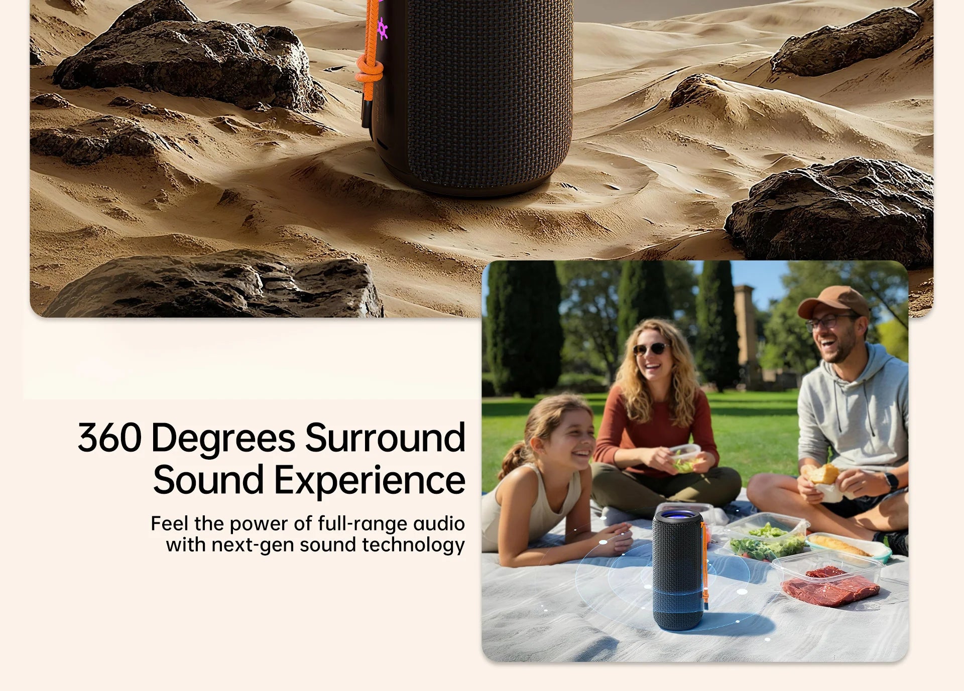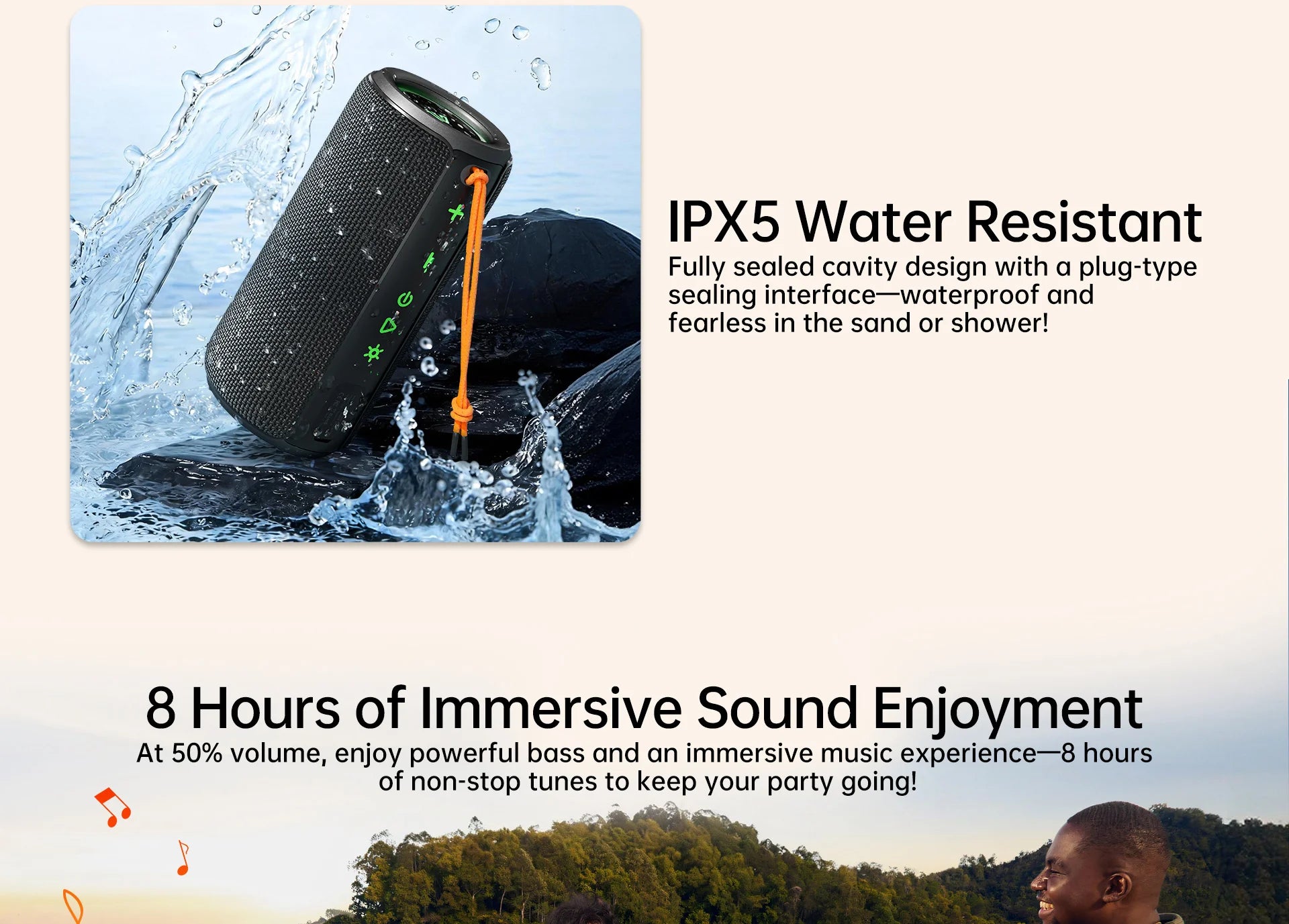 - IPX5 Waterproof Portable: With an IPX5 rating, the speaker is resistant to water, dust, and mud, making it ideal for outdoor adventures. Its rugged, flexible design and portable strap make it a convenient choice for both home use and travel. A perfect gift for any occasion.