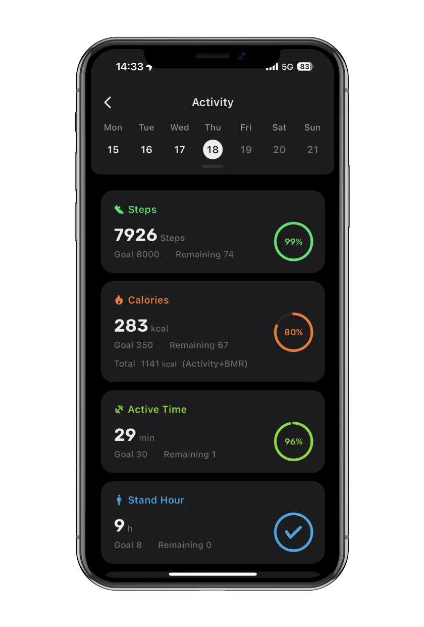 - Manual Measurements: Sleeping, Heart Rate, Blood Oxygen, Stress Level