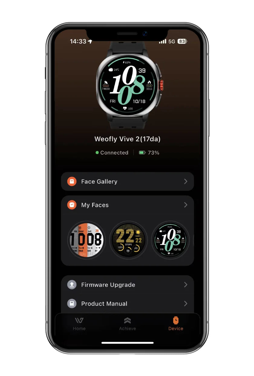 Customize the functions on your watch face according to your habits and preferences, and enjoy a more convenient and seamless experience with the Weofly Vive 2.