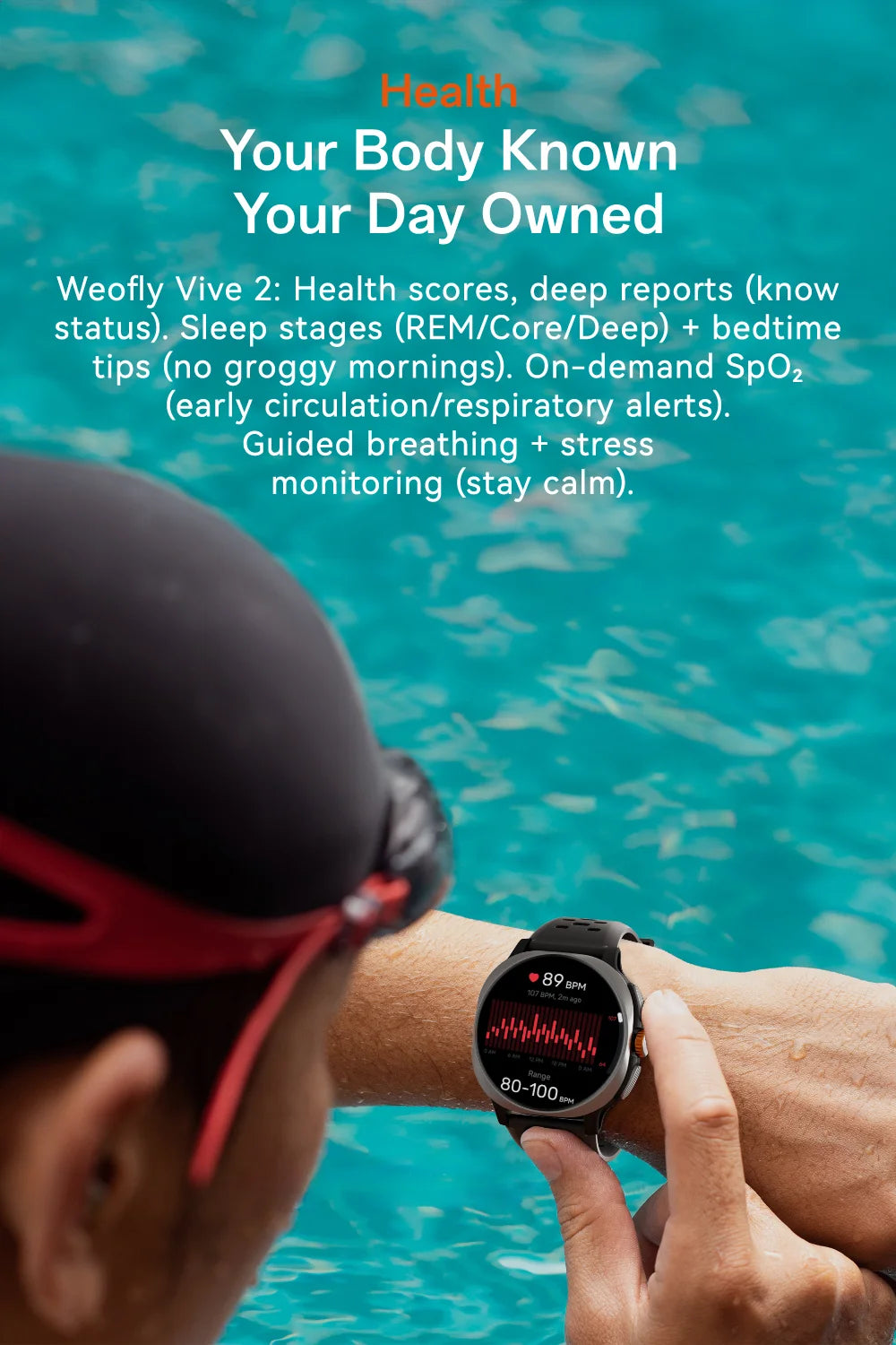 - 5ATM Waterproof & Automatic Workout Detection: The Weofly Vive 2 smartwatch offers plentiful professional workout modes, including cycling, strength training, running, swimming, and yoga. It is water-resistant up to 5ATM and features altimeter and barometer, making it ideal for swimming and skiing, hiking.